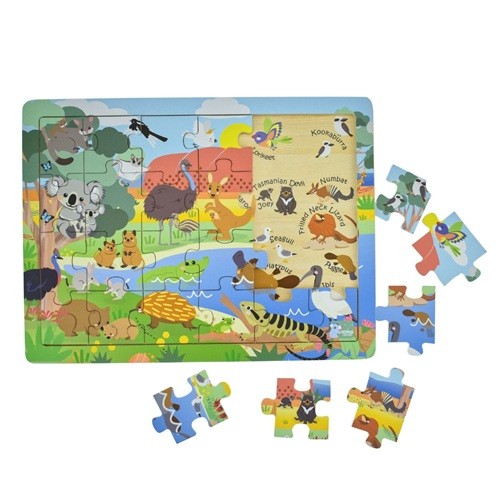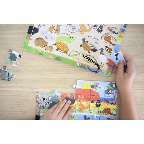 Celebrate Australia’s unique wildlife with this 24-piece jigsaw puzzle: Aussie Animals and Their Names. This beautifully illustrated wooden puzzle showcases an iconic Australian landscape, complete with a winding river, lush bushland, and Uluru in the background. Each puzzle piece features a native animal, from the crocodile and platypus to the koala, rainbow lorikeet, and ibis.