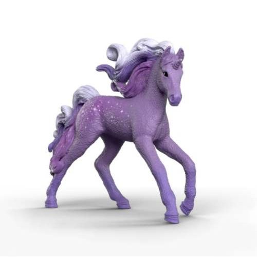 Playful and curious, the Galaxy Rainbow Unicorn Foal explores the magical world of BAYALA®. With light purple fur and a mane and tail that are particularly lush, a whole starry sky glitters on his flank. The foal loves to frolic among shining galaxies and sparkling rainbows while being looked after by its family.