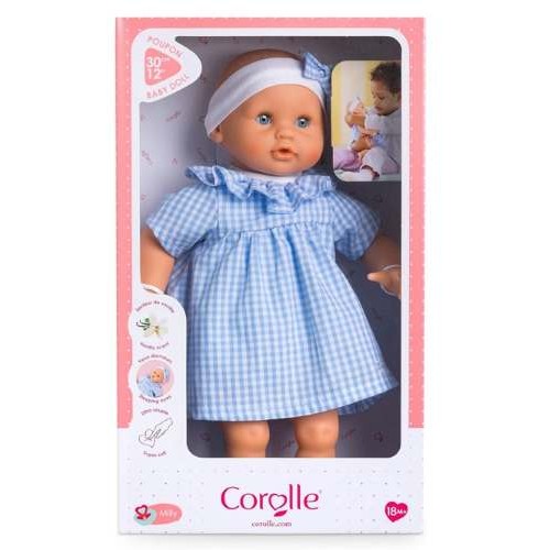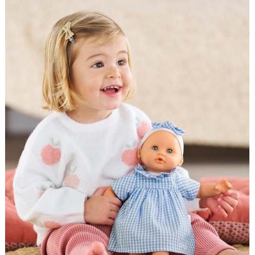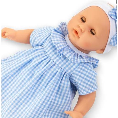 Beautifully dressed in a blue plaid dress and a white headband with a matching bow, the Bebe Calin Milly Doll is sure to fill the heart with delight.