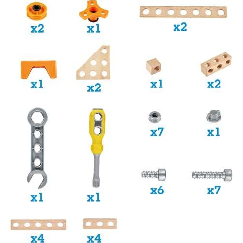 Includes: 1 x 1 hole block 2 x 3 hole blocks 4 x 3 hole strips 4 x 5 hole strips 2 x 7 hole strips 2 x triangular planks 7 x long screws 6 x short screws 7 x nuts 1 x cap 1 x 3 hole rotator 1 x 3 hole base stand 2 x small wheels 1 x philips screwdriver 1 x wrench.