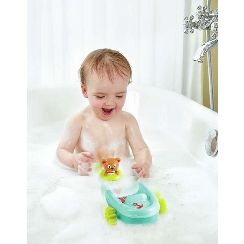 Make bath time fun with this splendid speedboat, complete with a tubing bear! Pull the back on his string and the boat will actually move through the water, pulling the bear behind on a tube until he reaches the boat safely. See if the boat can make it from one end of the bath to the other before the bear catches up!