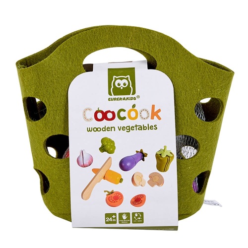 Includes 1 green pepper, 1 tomato, 2 mushrooms, 1 onion, 1 carrot, 1 eggplant, 1 cauliflower and 1 realistic play knife. Touch-sensitive vegetables make a realistic crunching sound when sliced. The cauliflower is joined together with a magnet and separated into 3 pieces which then “magically” join together when brought together. Eggplant, tomato and pepper have a stem that can be torn off with your hands