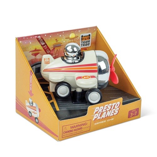 Hey, presto! This retro mini racing plane is ready to roll (not fly). Kids will have a hoot with these nimble little battery-free vintage-styled planes. Activate the propulsion mechanism with a simple press-down of the pilot, and they’re off! In three fun and collectable designs.