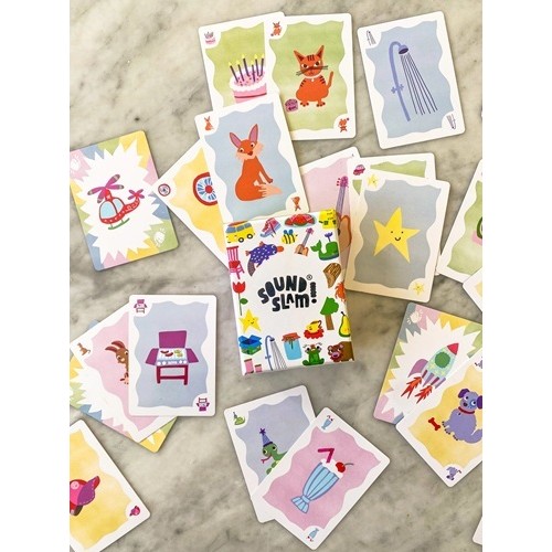 Sound Slam includes 69 beautifully hand drawn playing cards. Each card purposefully includes no letters so as not to distract players from practising the critical skill of phonological awareness (ability to recognise words are made up of sounds).