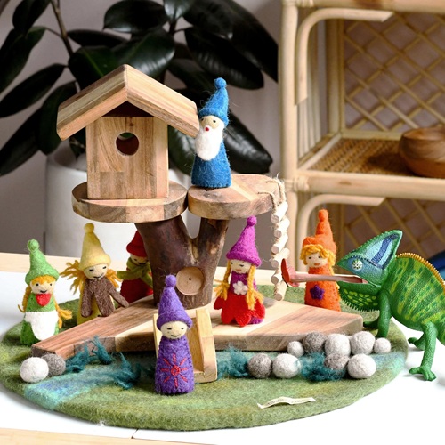 Create the perfect backdrop to an invitation to play for your fairy houses, loose parts play or wooden treehouses. Our round playscape is decorated with a gentle river, green patches, long bluish grass and felt stones.