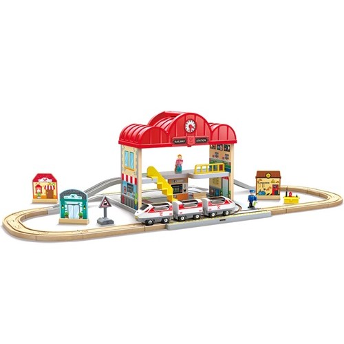 The Hape Railway Portable Train Station Set brings the excitement of trains and travel right into your home! With 41 pieces, including tracks, a 3-car train, a conductor, and various accessories, this set offers endless possibilities for imaginative adventures.