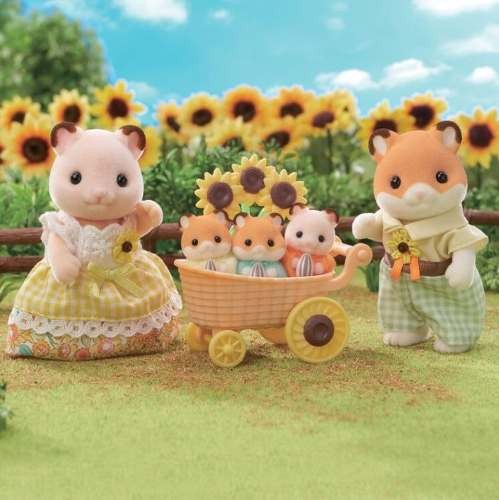 Meet the Hamster Family, an adorable set from Sylvanian Families This charming trio includes Dad Toby, Mom Penny, and three tiny babies – boys Sam and Upton, and girl Nora. One of teh babies with a cheeky “munching” expression—all dressed in matching sunflower-themed outfits. The set comes with a sunflower-motif baby stroller and bouquet, and posable heads and limbs (baby heads turn!).