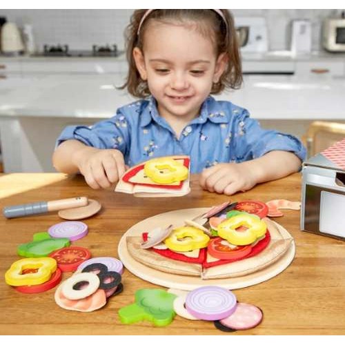 Pizza playset with lots of toppings.  Includes one pizza base which can be cut into slices, one pizza slicer, one cutter, lots of pieces of seafood, vegetables, tomato's and other pizza toppings and even a pizza oven which doubles as a delivery box