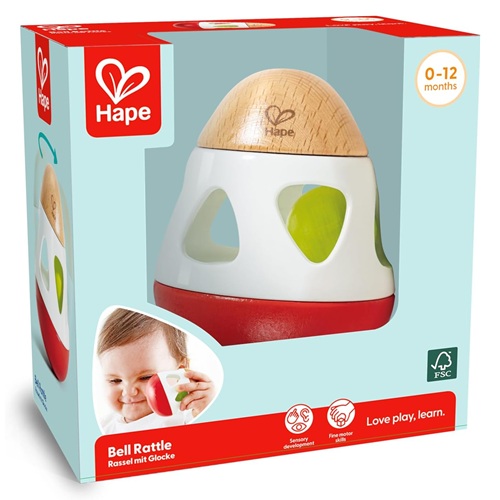 Hape bell rattle-roll this clever rattle away from you and it loops right back - a little like a boomerang. Easy for small hands to grasp, it has a pleasant sounding bell inside.