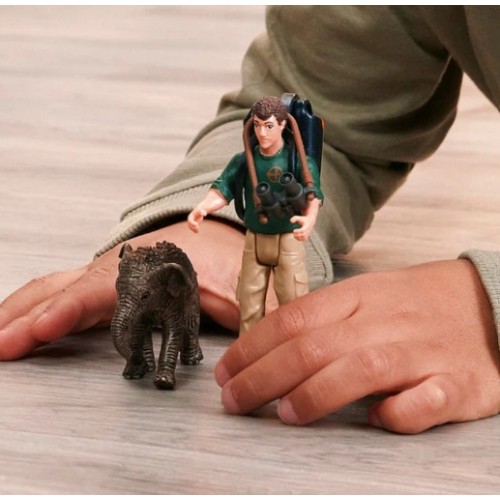 1x researcher Flynn, 1x Asian elephant baby, 1x backpack, 1x binoculars